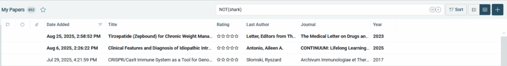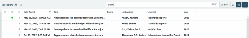 Searching by default will search all the fields for you. For example, if you want to search for “Shark” all you need to do is type shark into the search box and the app will return results back to you in any field. This includes abstracts, notes you have taken, highlighted text, Journal, etc.
