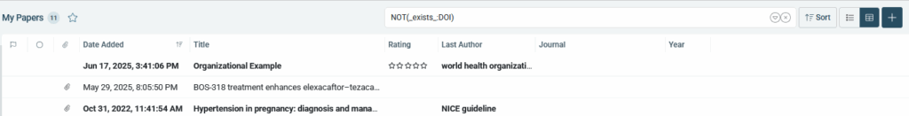 You can also pair it with _exists_ to find references missing attachments NOT(_exists_:files) or papers missing a DOI NOT(_exists_:DOI):