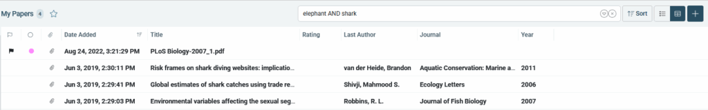 Combining search terms is easy as well. Just type all of your search terms with a space in between. If you are searching for all papers for Elephants and Sharks you just need a “space” but you can also use the AND query. Elephant Shark is the same as elephant AND shark. AND must be capitalized to work