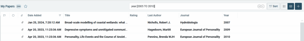 The year field also supports ranges. For instance, if you want to list all the papers in the library from the year 1990 to 1993, you need to input: year:[2005 TO 2010]