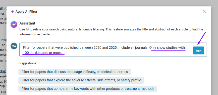 4. Click ‘Ask’ to filter your results, bringing high-priority studies to the top and minimizing manual sifting.
