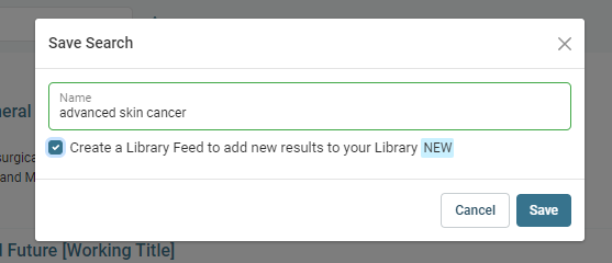 Once you click to “favorite” your search, a menu will pop up asking if you’d like “to create a Library Feed to add new results to your Library”. You’ll want to check that box and hit “save”