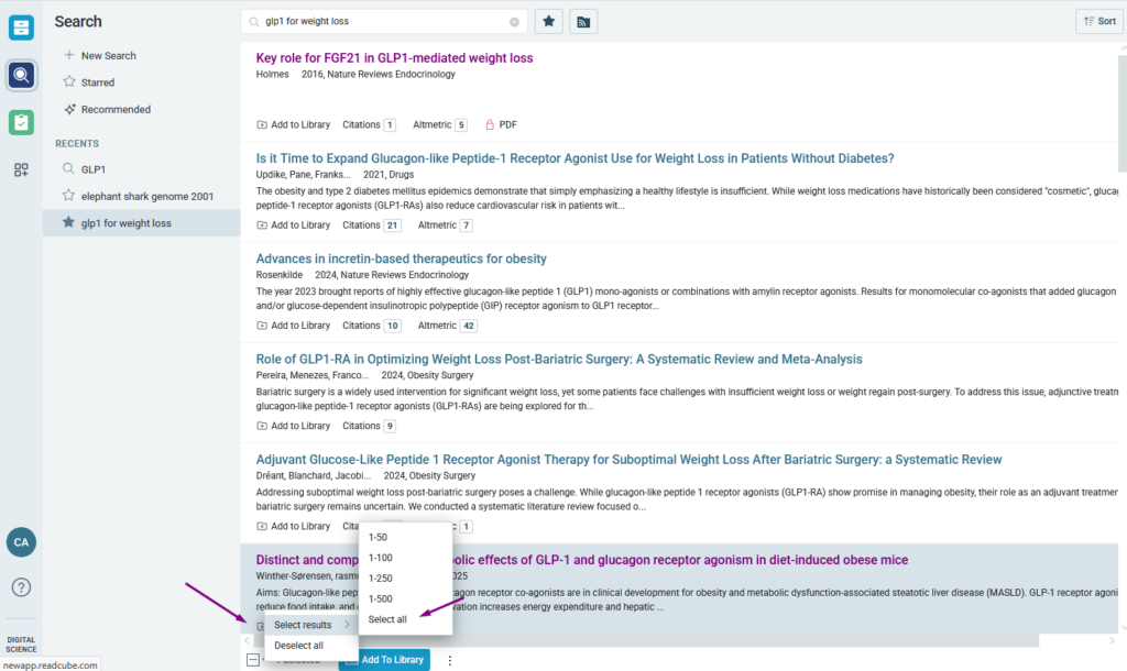 Note: following the steps above will save your search to your library, but those results may not appear for up to 24-hours as that is how often ReadCube checks for new content available. To auto deposit your search into your library and immediately bring in the current results, please do the following: