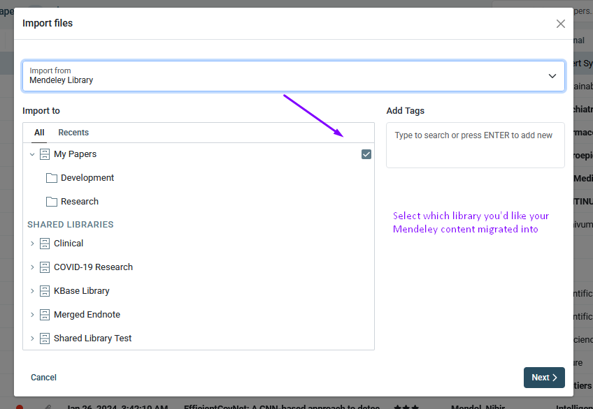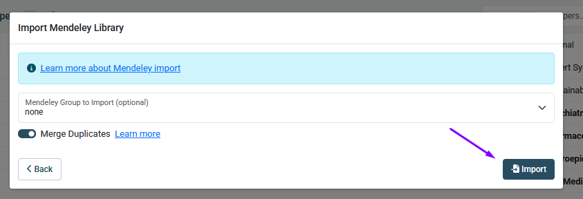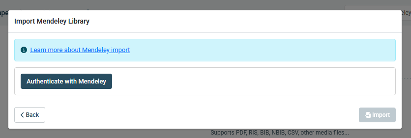 Once you’ve made your selection, hit “next” on the bottom right and you’ll be asked to log in with your Mendeley credentials.