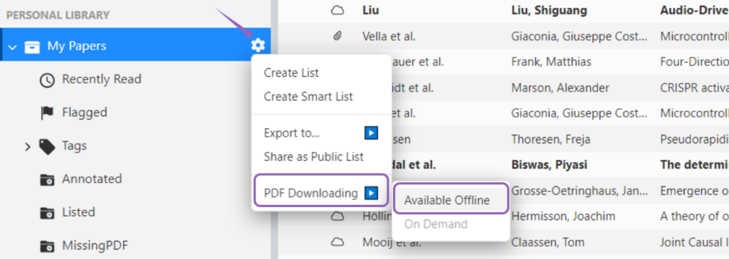 A: If you choose the “Available Offline” option you will download the entire personal or shared library and it will auto download any new papers you add if you keep that option enabled. It is not possible to choose specific papers, lists or sublists within those libraries to download.