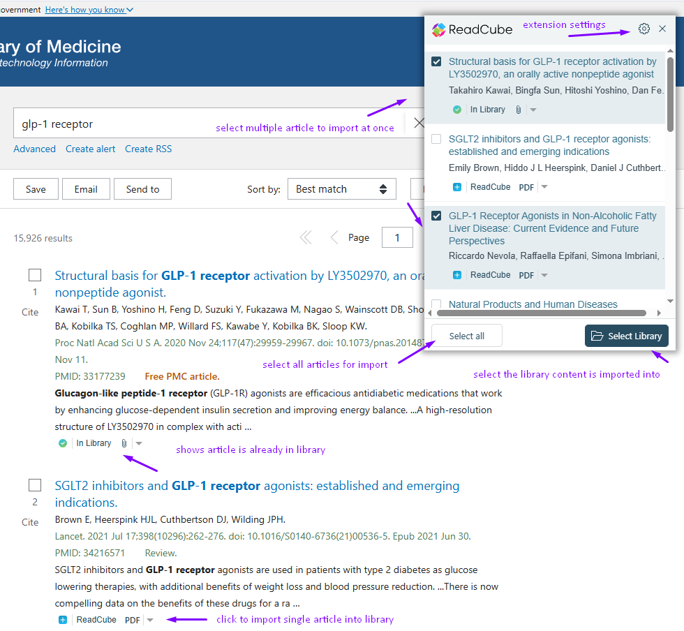 You can select a single or multiple articles for import, select which library you’ve like them imported into and more: