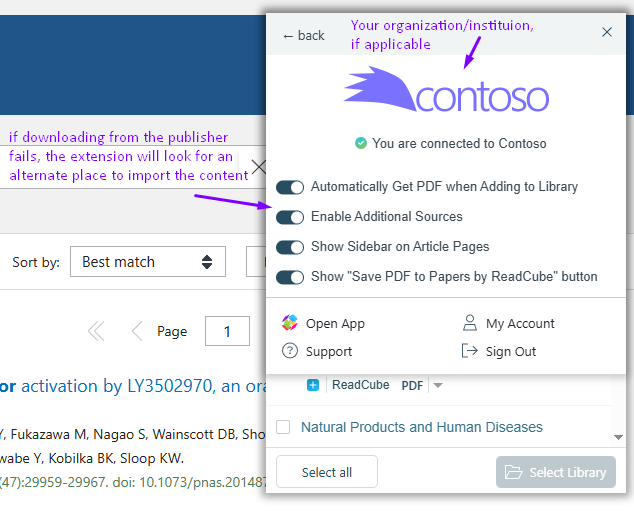 In the Settings of the browser extension, you’ll also have more options including the ability to “enable additional sources”, so if the import from the publisher fails, the browser extension will search for another source to import that article from: