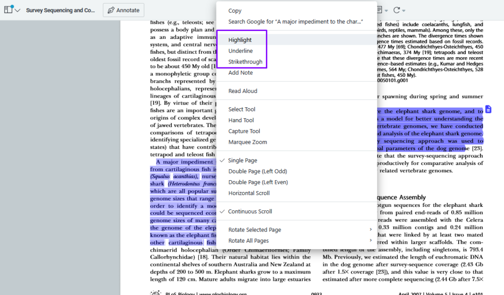You can also first select the text you want to annotate, right-click on it and then choose an annotation type from the drop-down menu: