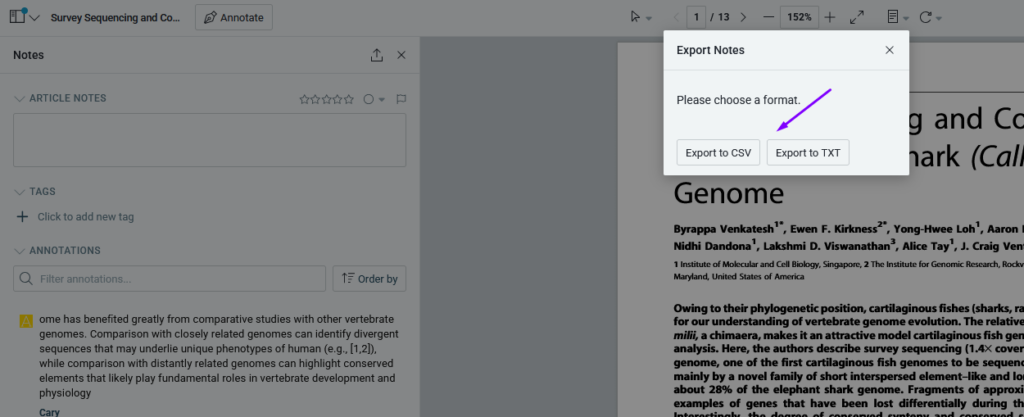 You’ll then be able to export the notes associated with your article in either .txt or .csv format